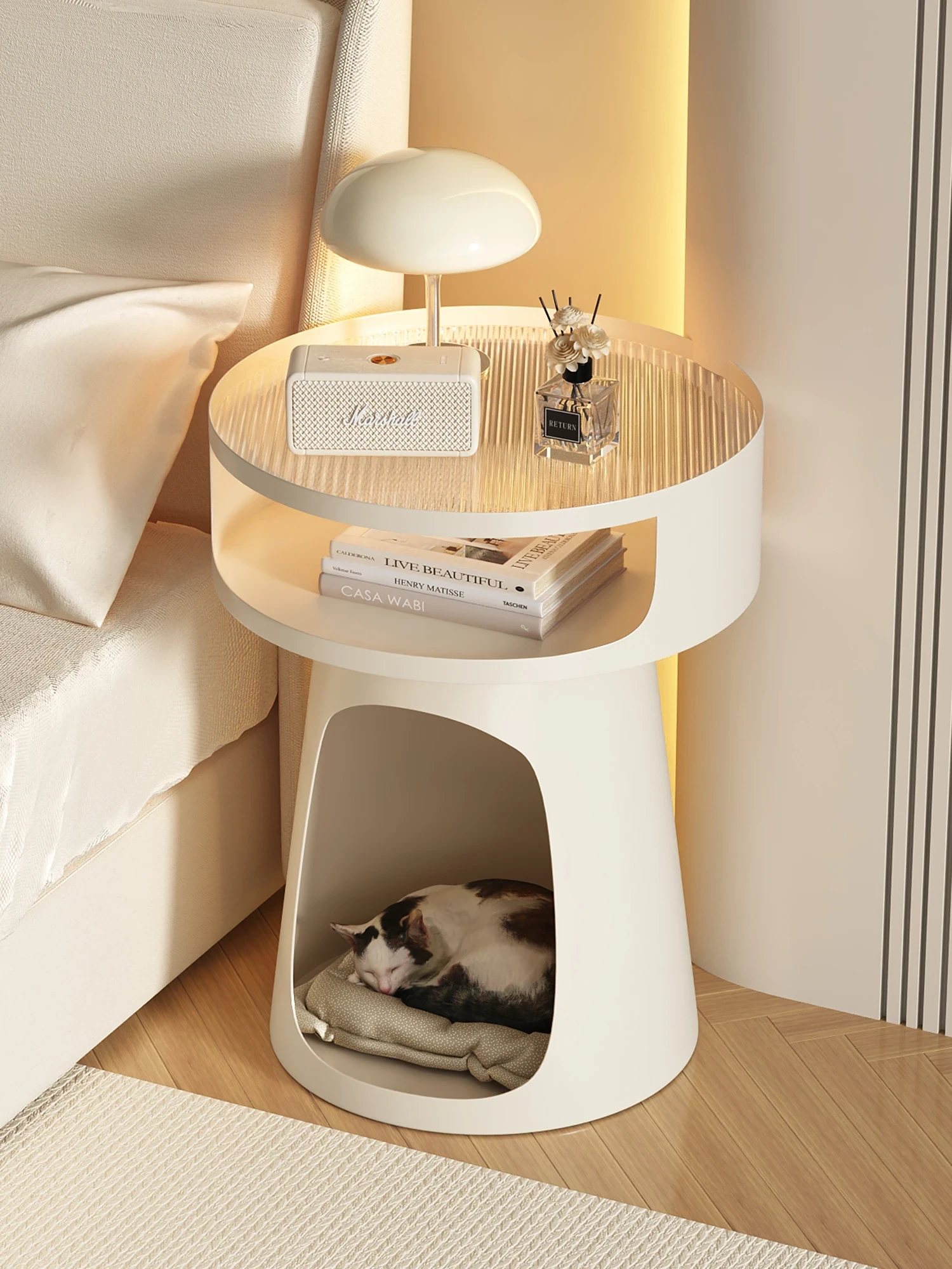 Elegant Iron Nightstand with Cream Finish - Compact Bedside Table for Home, Featuring a Cozy Cat Nook and Round Design, Perfect for Storing Essentials and Enhancing Your Bedroom Decor.
