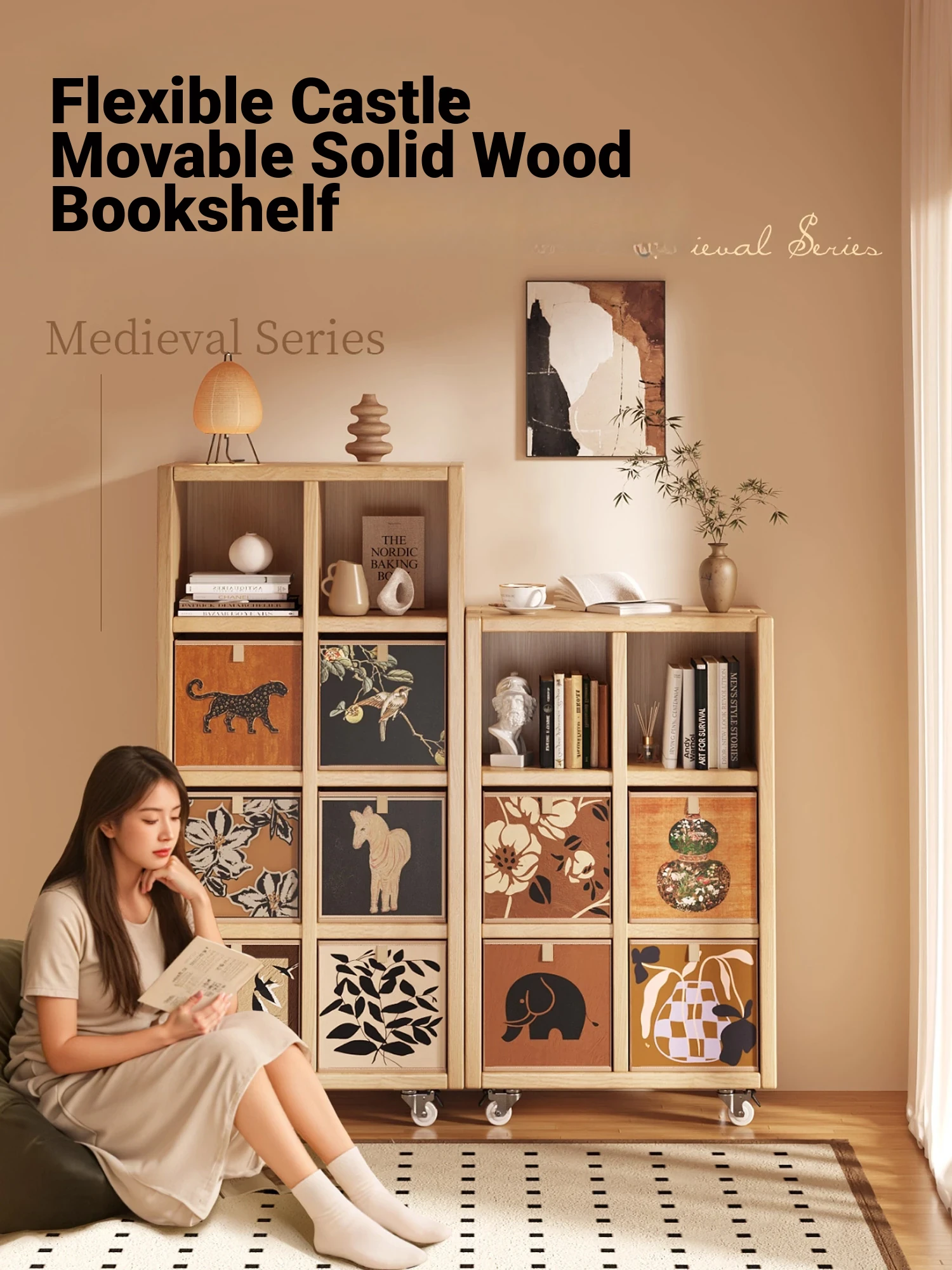Portable Solid Wood Bookshelf with Wheels – Versatile Storage Rack for Kids' Backpack – Japanese Style Low Cube Cabinet, Perfect for Home or Kindergarten Use