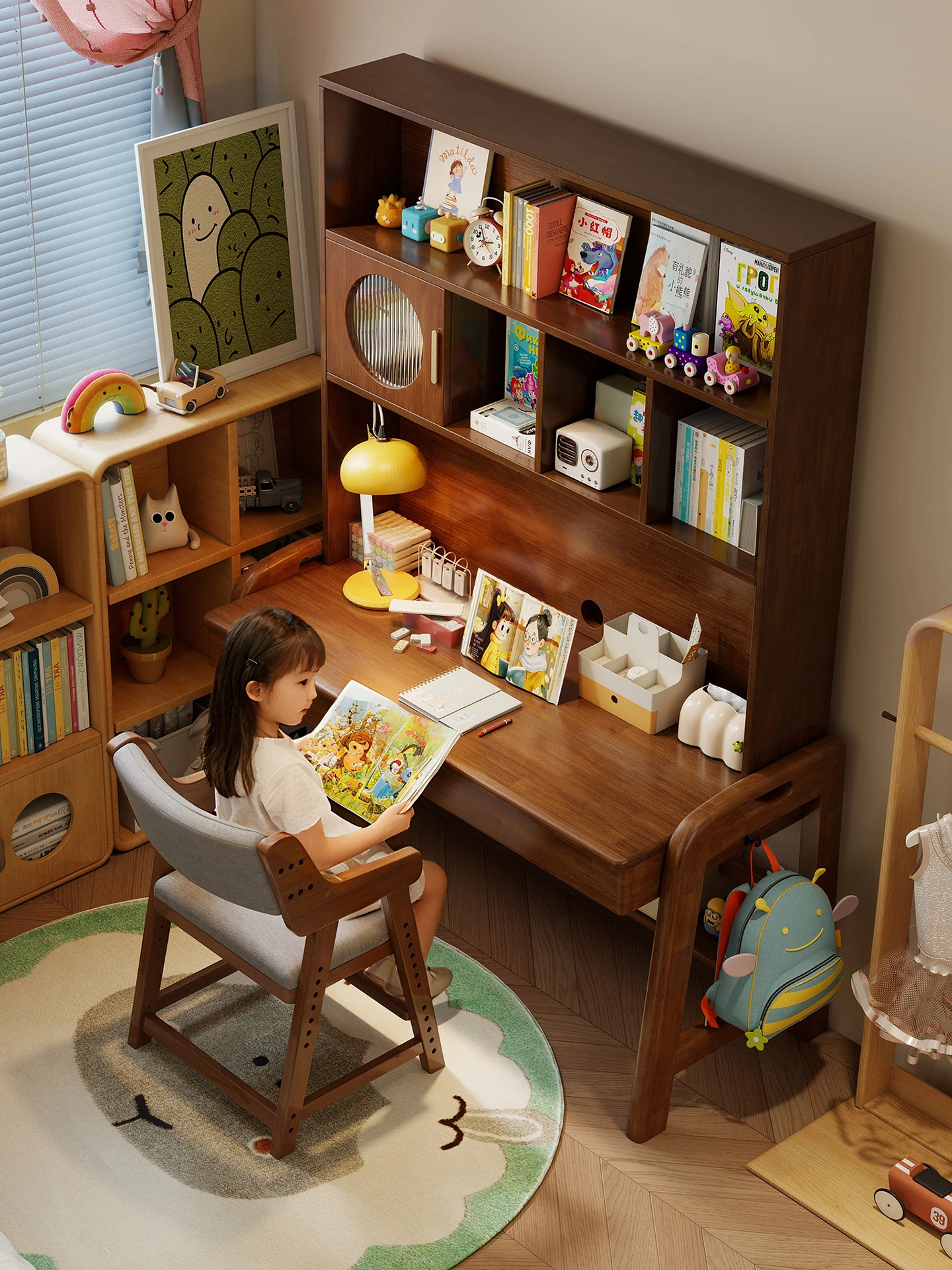 Premium Solid Wood Adjustable Study Desk for Kids - All-in-One Writing Table with Bookshelf and Computer Desk for Middle and Primary School Students, Perfect for Home Use