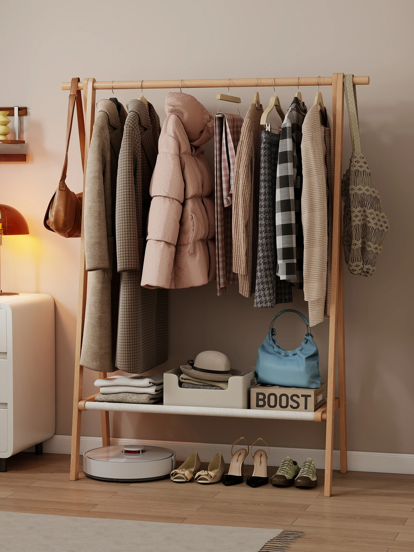 Solid Wood Freestanding Clothes Hanger - Stylish Bedroom Garment Rack, Versatile Storage Shelf, Elegant Coat Stand, Ideal for Home Use, Durable Wooden Drying Rack