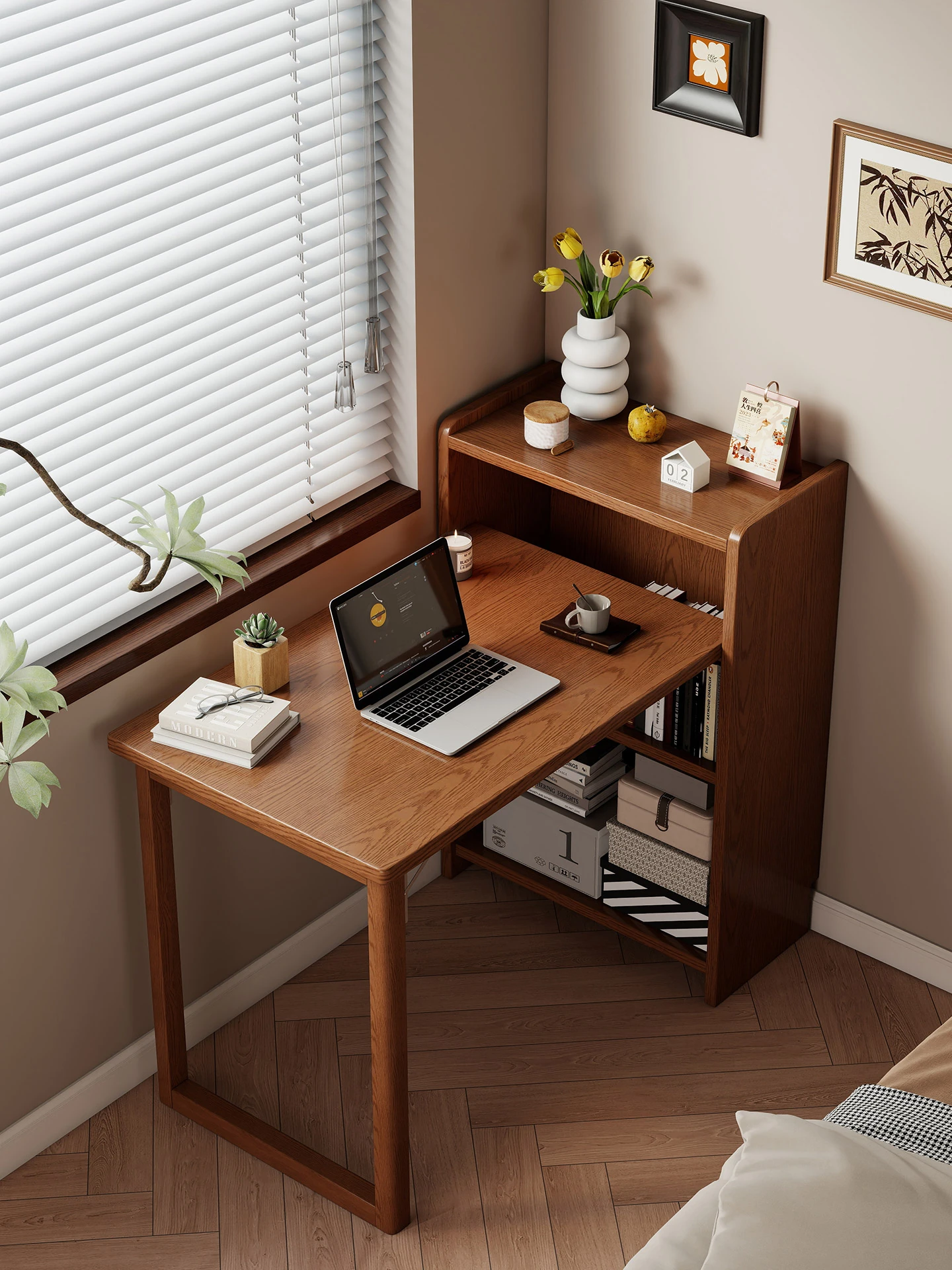 Compact Solid Wood Folding Desk and Bookshelf Combo for Small Spaces – Ideal for Bedrooms, Home Offices, and Student Study Areas. Perfect for Efficient Work and Learning!