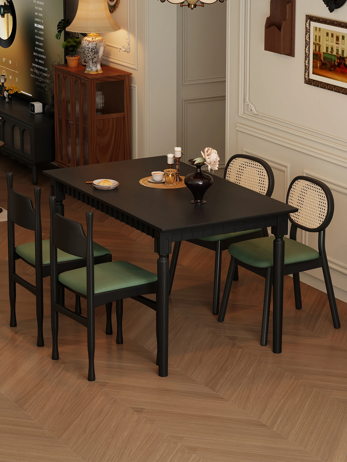 French Vintage Black Solid Wood Dining Table and Chair Set - Scandinavian Style for Small Spaces, American Rectangular Dining Table Perfect for Cozy Meals