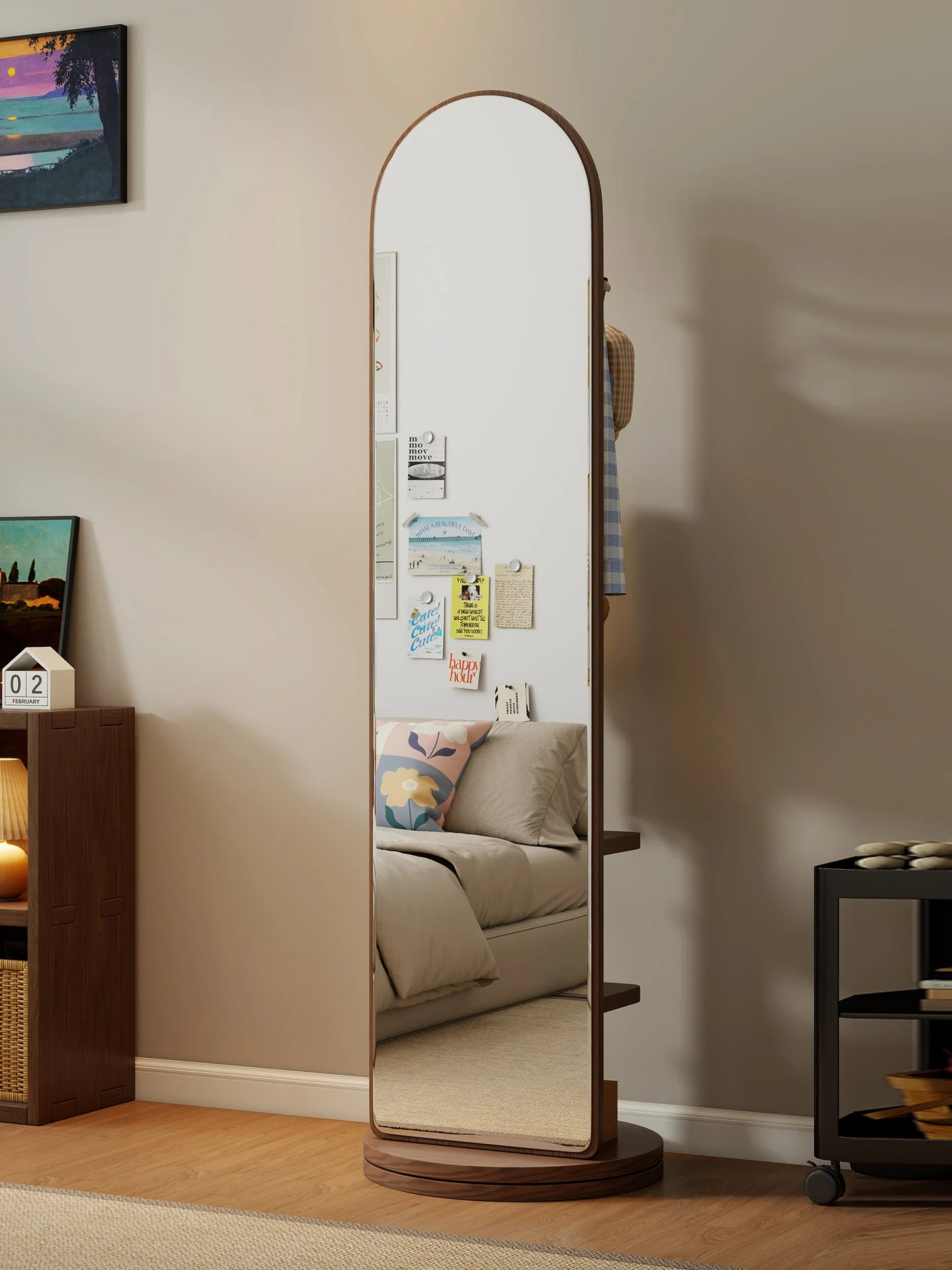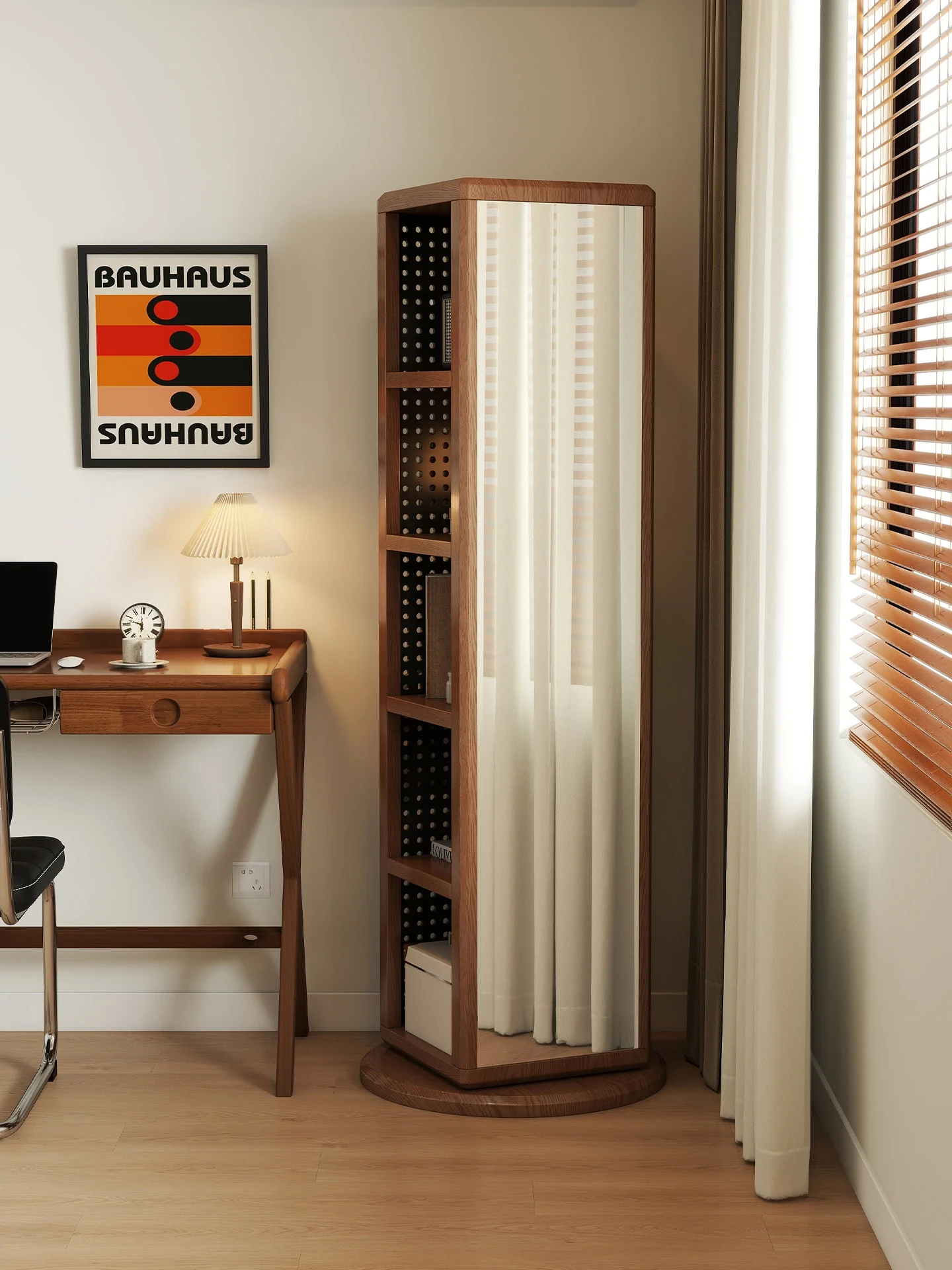 Multifunctional Solid Wood Full-Length Mirror with Rotating Bookshelf - Versatile Floor Stand Storage Rack for Bedroom, Featuring Pegboard Hooks for Easy Organization