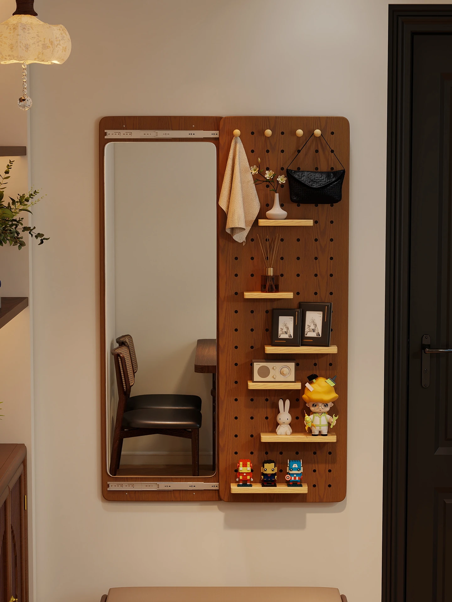 Elegant Solid Wood Pegboard Dressing Mirror - Hidden Sliding Full-Length Mirror for Bedroom, Ideal for Home Try-On & Entryway Use