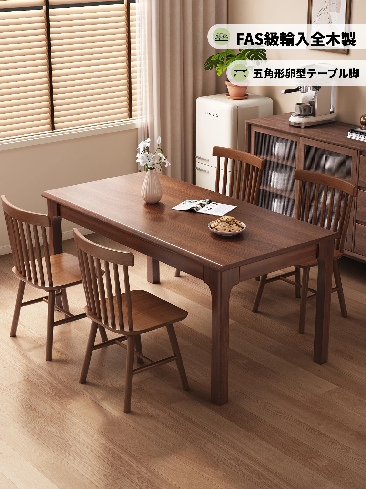 ウォールナット材のシンプルな長方形ダイニングテーブル - 小さな家にぴったりの実用的な木製テーブル&チェアセット。スタイリッシュで温かみのあるデザインで、家族の食卓を彩ります。