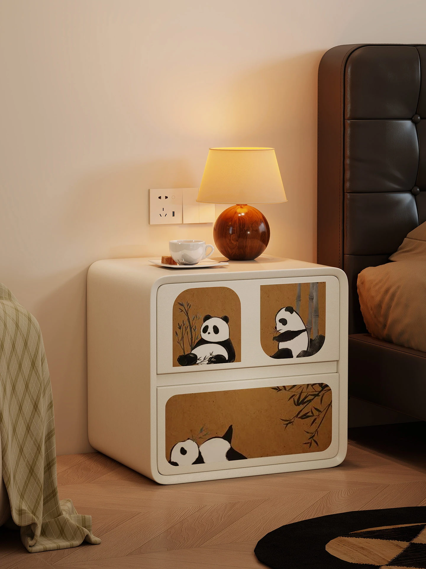 クリーミーな風合いの無垢材ベッドサイドキャビネット|新作!おしゃれで機能的なパンダデザインの収納ボックス|寝室にぴったりな中古スタイルの小物収納キャビネット!