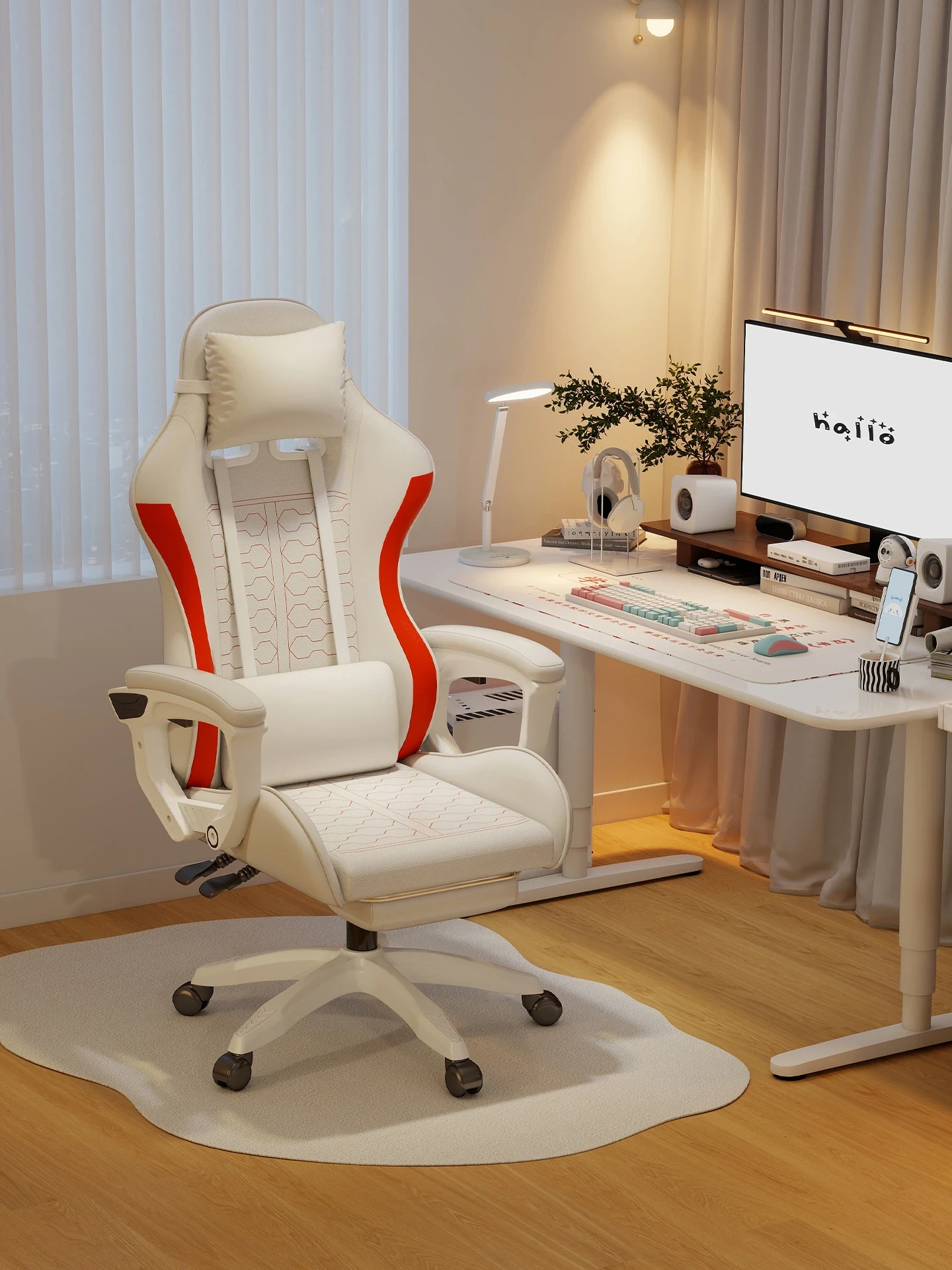 エルゴノミックゲーミングチェア|昇降&リクライニング機能付き|快適な座り心地で長時間作業も楽々|学生寮や家庭用に最適|女性にもぴったりな背もたれデザイン!