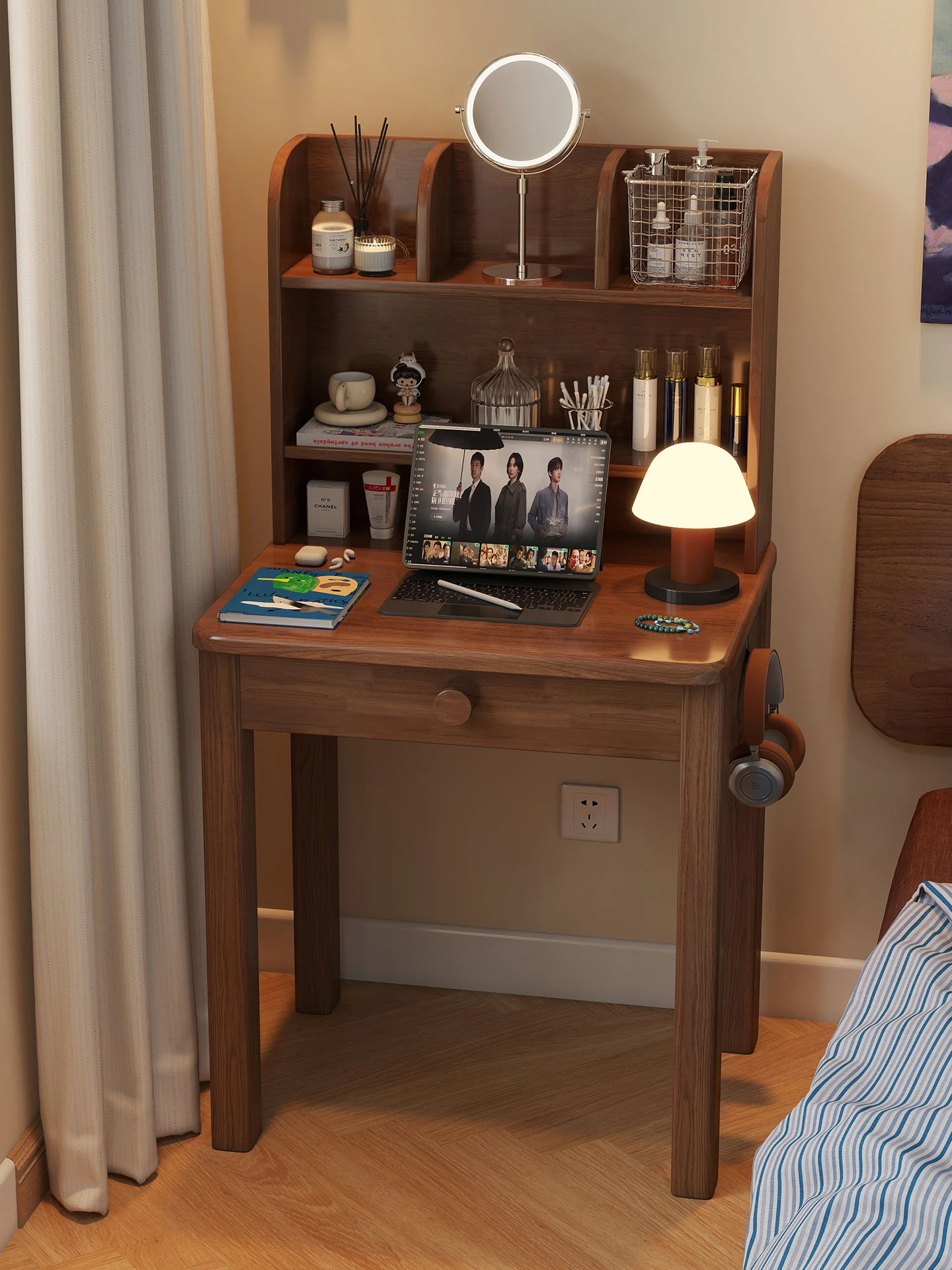 ナチュラルウッドのスリムデスク - 寝室や小さな部屋に最適な化粧台兼用の学習デスク。初高中生にもぴったりなスタイリッシュで機能的なデザイン!