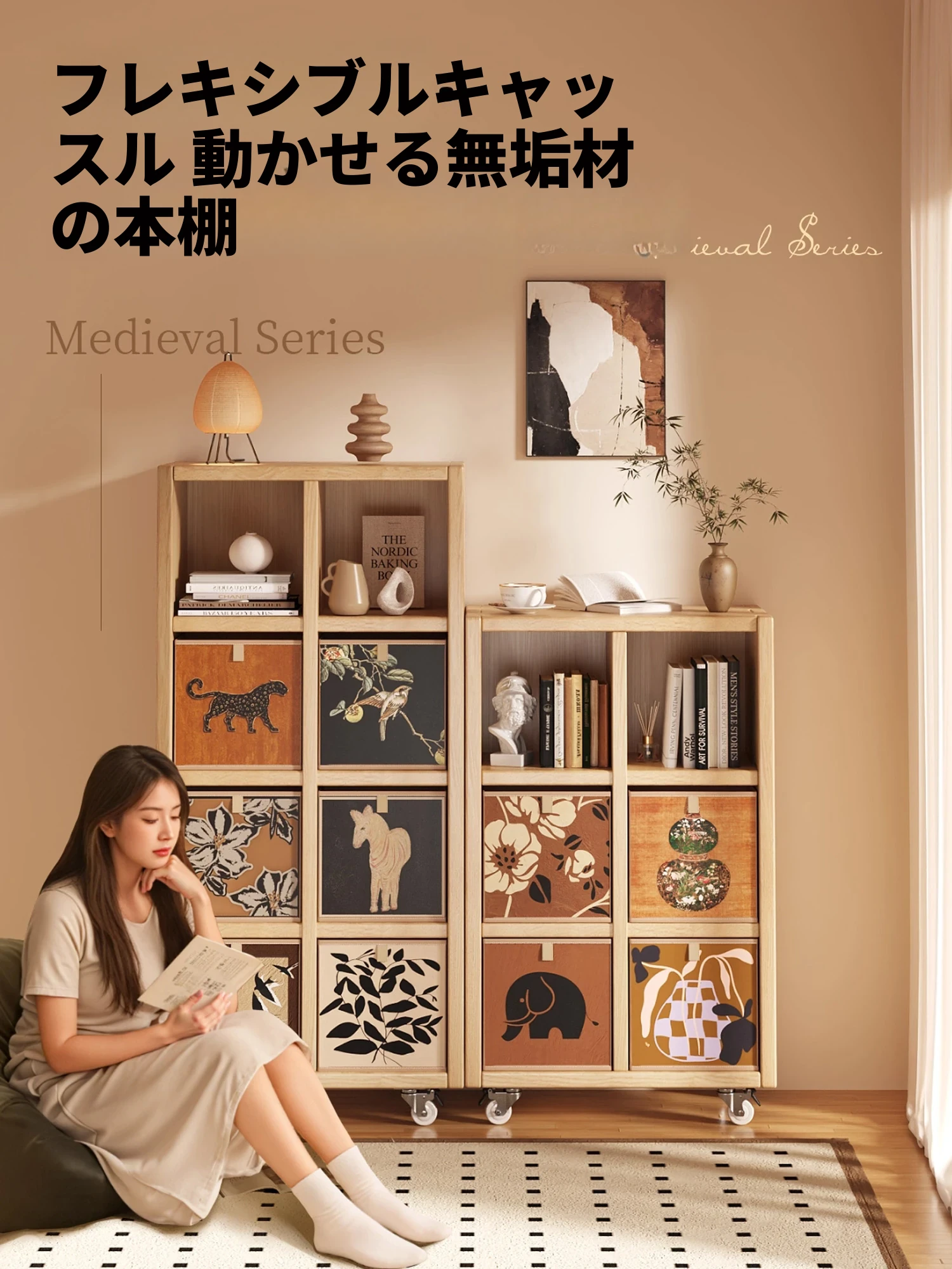 移動式無垢材書架 - 車輪付きで便利!壁に寄せて使える幼稚園用ブックラック、シンプルな日本風のグリッドデザインで収納力抜群!低めのサイズでスペースを有効活用。