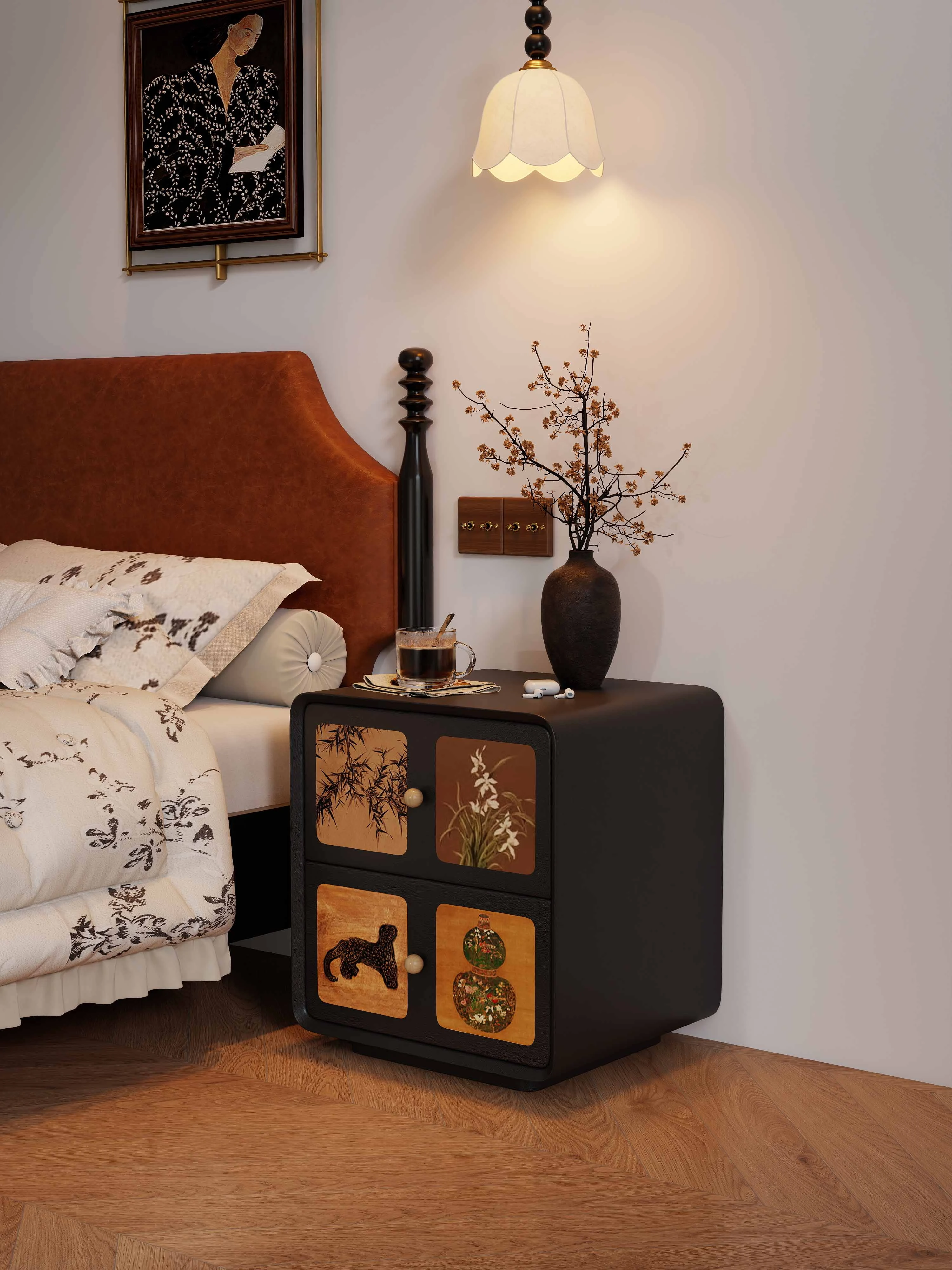 レトロデザインの中古風ベッドサイドキャビネット - 本格的な無垢材使用、オシャレな黒の塗装仕上げで収納力抜群!主寝室にぴったりのクリエイティブなアイテムです。