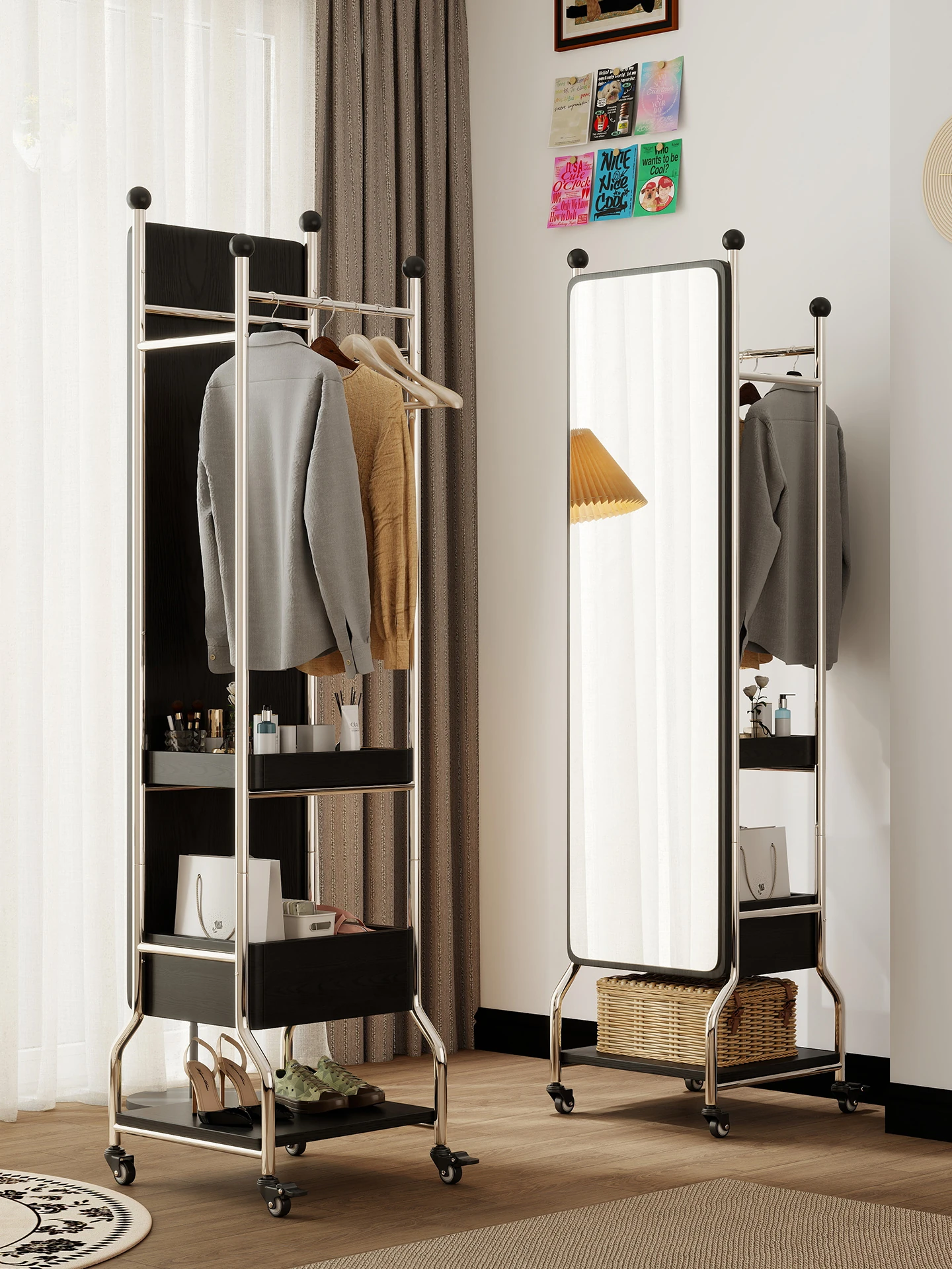 ヴィンテージ風の無垢材全身鏡|回転式・移動可能|衣類収納付きのスタイリッシュなドレッシングミラー|寝室や玄関に最適な一体型ミラー!